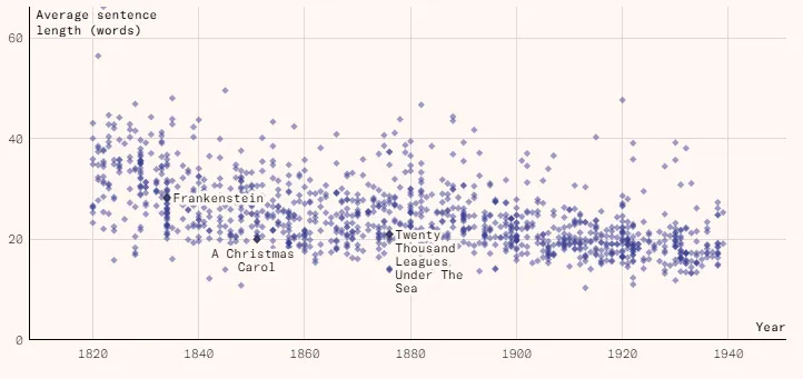 O tamanho médio de uma frase na literatura diminuiu de 20-45 palavras nos anos 1820 para 10-25 palavras nos anos 1920.